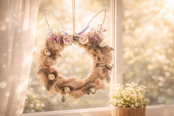 Breng een warme en sfeervolle paassfeer in huis met deze unieke handgemaakte paaskrans met konijnenoren. De krans is met zorg samengesteld uit natuurlijke materialen zoals jute, veren en kwartel eitjes, afgewerkt met subtiele bloemen en zachte pasteltinten.